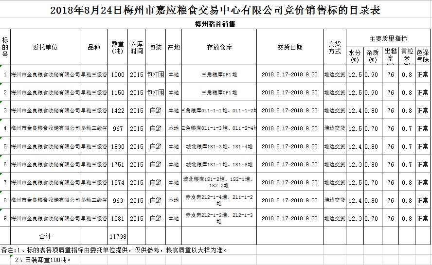 受客戶委托,梅州市嘉應(yīng)糧食交易中心有限公司定于2018年8月24日(星期五)舉辦糧食競(jìng)價(jià)交易會(huì),梅州市金良糧食收儲(chǔ)有限公司擬銷售早秈稻11738噸。