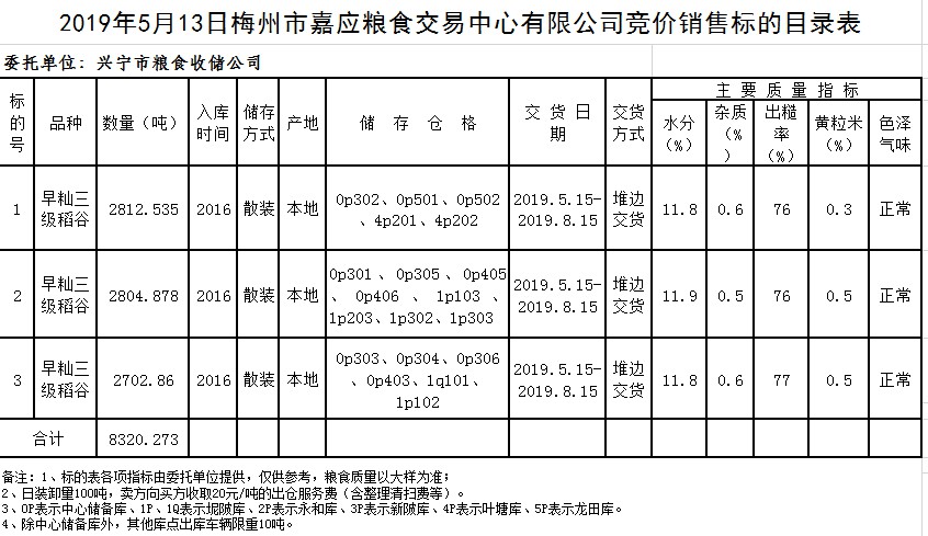 交易時(shí)間和地點(diǎn):2019年5月13日(星期一)上午10時(shí)。廣東省梅州市彬芳大道南161號(hào)梅州市糧食交易中心3樓。