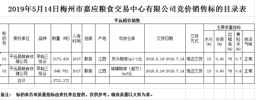 交易時間和地點:2019年5月14日(星期二)上午10時15分。廣東省梅州市彬芳大道南161號梅州市糧食交易中心3樓。