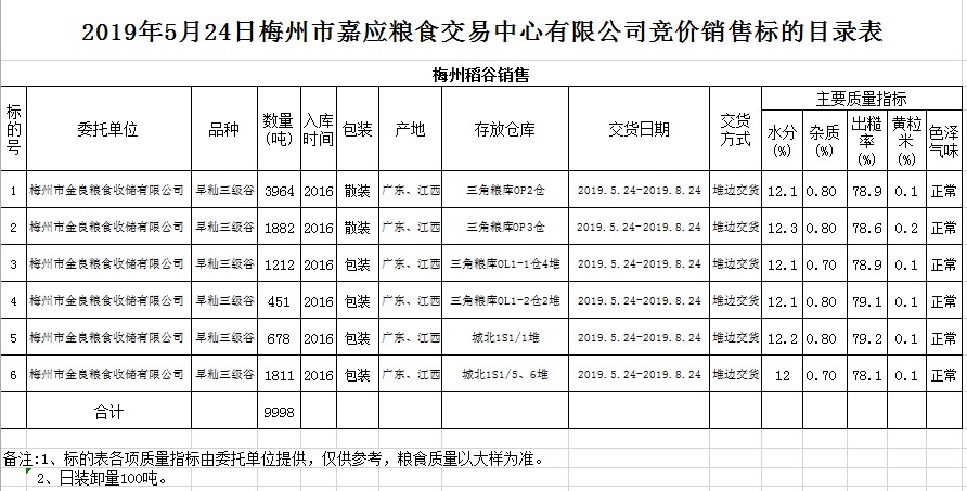 受客戶委托,梅州市嘉應(yīng)糧食交易中心有限公司定于2019年5月24日(星期五)舉辦糧食競(jìng)價(jià)交易會(huì),梅州市金良糧食收儲(chǔ)有限公司擬銷售早秈稻9998噸。
