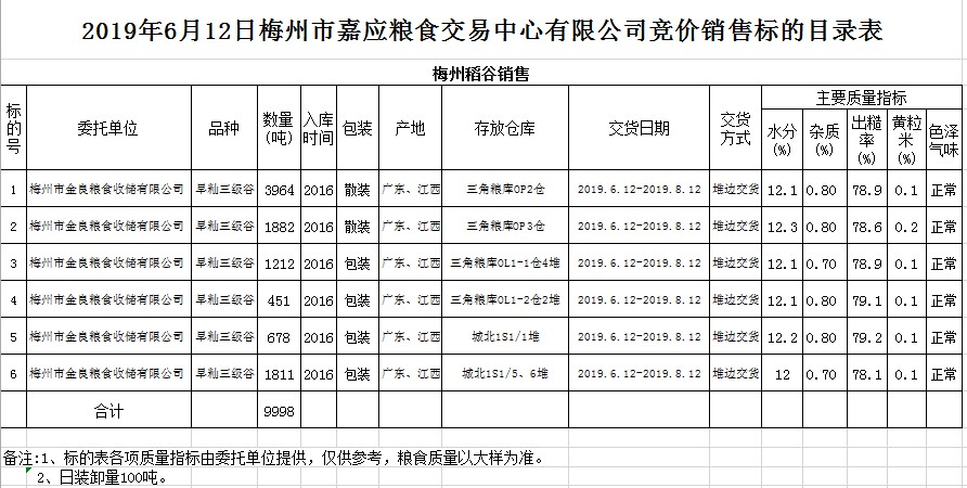 交易時間和地點:2019年6月12日(星期三)上午10時。廣東省梅州市彬芳大道南161號梅州市糧食交易中心3樓。