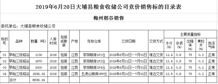 受客戶委托,梅州市嘉應(yīng)糧食交易中心有限公司定于2019年6月20日(星期四)舉辦糧食競價交易會,大埔縣糧食收儲公司擬銷售2016年早秈稻6639.24噸。