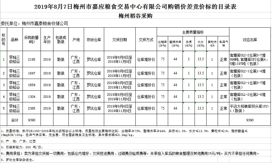 受客戶委托,梅州市嘉應糧食交易中心有限公司定于2019年8月7日(星期三)舉辦稻谷購銷價差聯(lián)動標的交易會,梅州市嘉泰糧食收儲公司擬銷售和采購早秈稻9390噸。
