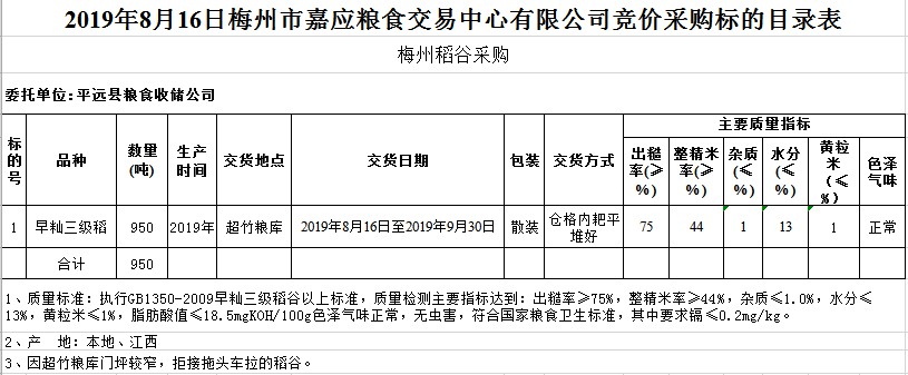 交易時(shí)間和地點(diǎn):2019年8月16日(星期五)上午10時(shí)。廣東省梅州市彬芳大道南161號(hào)梅州市糧食交易中心3樓。