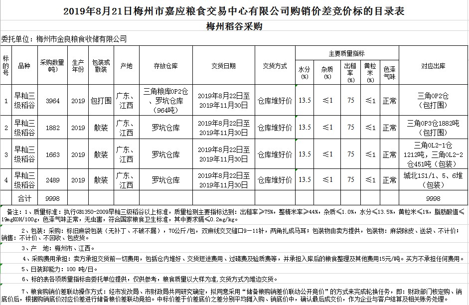 受客戶委托,梅州市嘉應(yīng)糧食交易中心有限公司定于2019年8月21日(星期三)舉辦稻谷購銷價差聯(lián)動標(biāo)的交易會,梅州市金良糧食收儲有限公司擬銷售和采購早秈稻9998噸。
