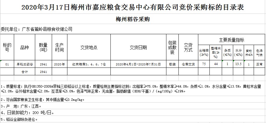 交易時間和地點:2020年3月17日(星期二)上午10時20分。廣東省梅州市彬芳大道南161號梅州市糧食交易中心3樓。