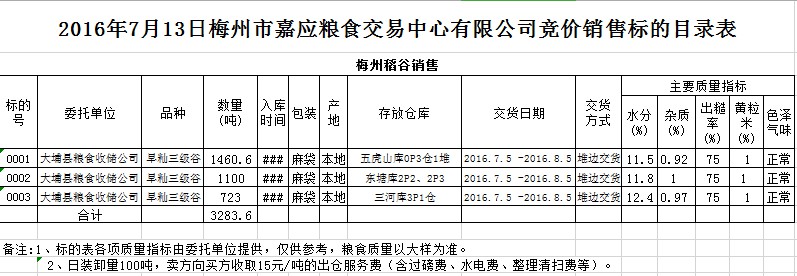 受客戶委托,梅州市嘉應(yīng)糧食交易中心有限公司定于2016年7月13日舉辦糧食競價交易會,大埔縣糧食收儲公司擬銷售2013年早秈稻谷3283.6噸。