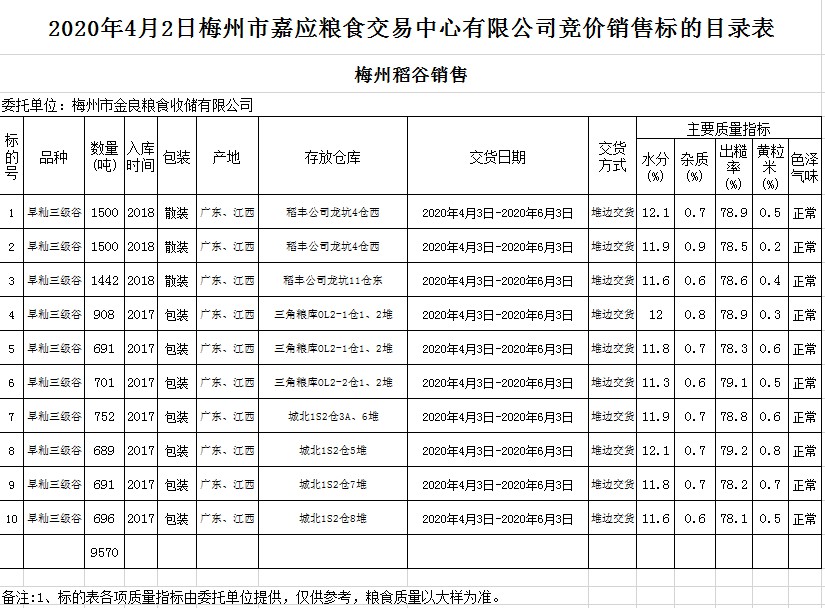 受客戶委托,梅州市嘉應(yīng)糧食交易中心有限公司定于2020年4月2日(星期四)舉辦糧食競價交易會,梅州市金良糧食收儲有限公司擬銷售2017年、2018年早秈稻9570噸。