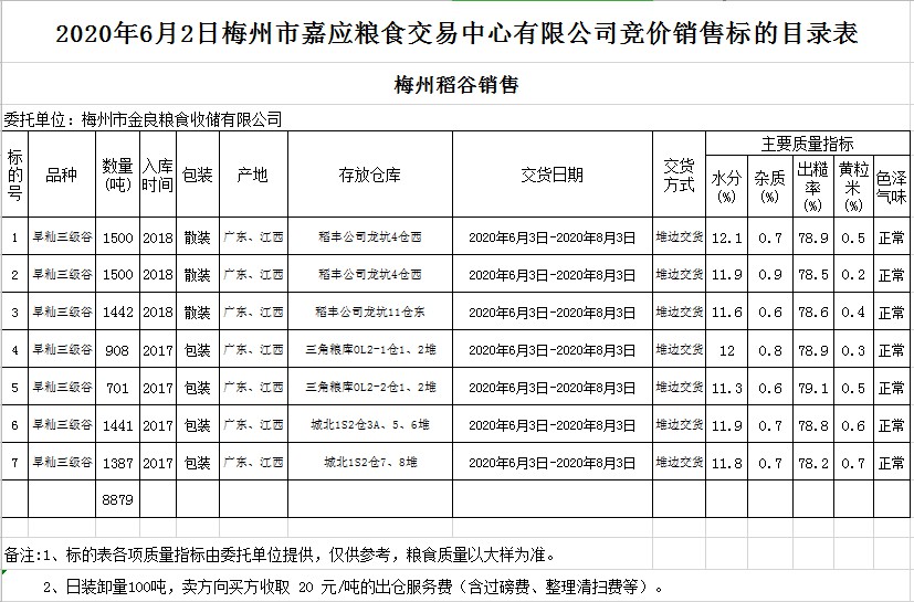 交易時間和地點:2020年6月2日(星期二)上午10時15分。廣東省梅州市彬芳大道南161號梅州市糧食交易中心3樓。