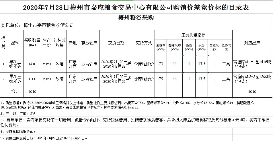 受客戶委托,梅州市嘉應糧食交易中心有限公司定于2020年7月28日(星期二)舉辦稻谷購銷價差聯動標的交易會,梅州市嘉泰糧食收儲公司擬銷售和采購早秈稻2616噸。