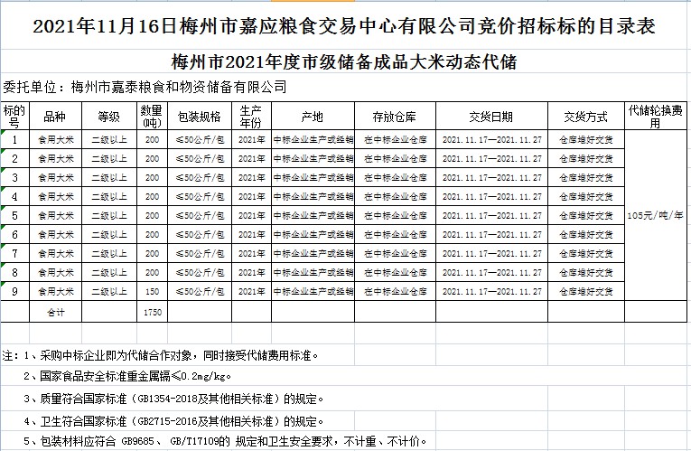 受客戶委托,梅州市嘉應(yīng)糧食交易中心有限公司定于2021年11月16日(星期二)上午10時(shí)在廣東省梅州市彬芳大道南161號梅州市糧食交易中心3樓,舉辦梅州市市級儲備成品糧油新一輪動態(tài)代儲采購及包干輪換費(fèi)公開招標(biāo)。