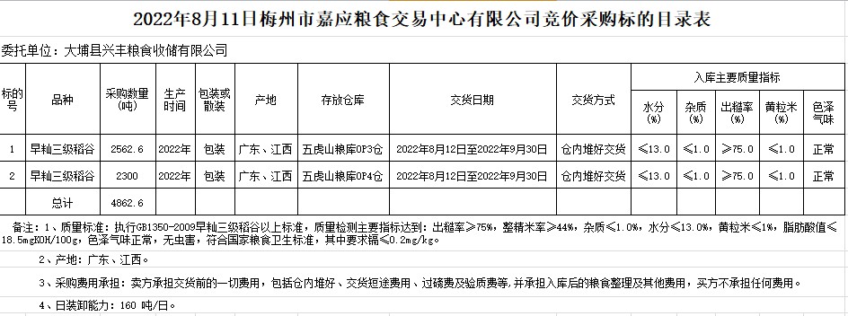 受客戶委托,梅州市嘉應(yīng)糧食交易中心有限公司定于2022年8月11日(星期四)舉辦糧食競價交易會。大埔縣興豐糧食收儲有限公司擬采購2022年早秈稻4862.6噸。