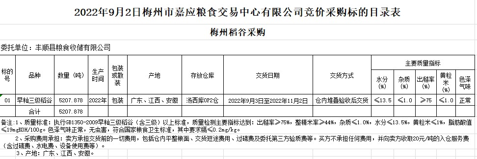 受客戶委托,梅州市嘉應(yīng)糧食交易中心有限公司定于2022年9月2日(星期五)舉辦糧食競價(jià)交易會(huì)。豐順縣糧食收儲(chǔ)有限公司擬采購2022年早秈稻5207.878噸。