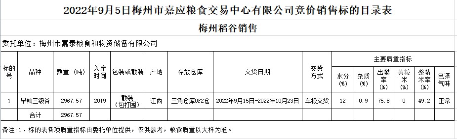 受客戶委托,梅州市嘉應(yīng)糧食交易中心有限公司定于2022年9月5日(星期一)舉辦糧食競價(jià)交易會。梅州市嘉泰糧食和物資儲備有限公司擬銷售2019年早秈稻2967.57噸。