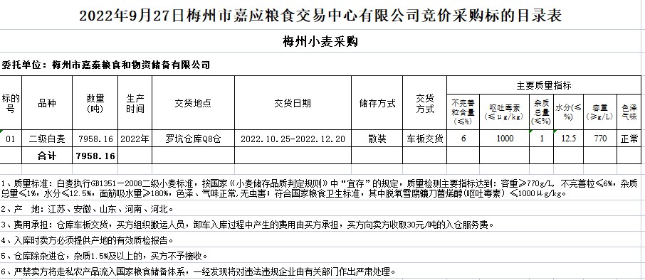受客戶委托,梅州市嘉應(yīng)糧食交易中心有限公司定于2022年9月27日(星期二)舉辦糧食競價交易會。梅州市嘉泰糧食和物資儲備有限公司擬采購2022年二級白麥7958.16噸。