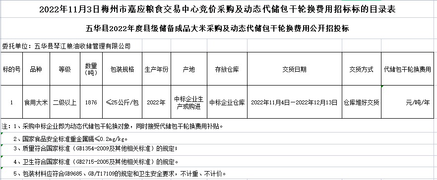 五華縣2022年縣級成品糧采購及動態(tài)代儲包干輪換費(fèi)用公開招標(biāo)公告