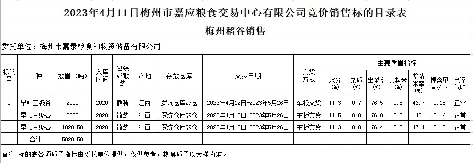受客戶委托,梅州市嘉應(yīng)糧食交易中心有限公司定于2023年4月11日(星期二)舉辦糧食競價(jià)交易會(huì)。梅州市嘉泰糧食和物資儲備有限公司擬銷售2020年早秈稻5820.58噸。