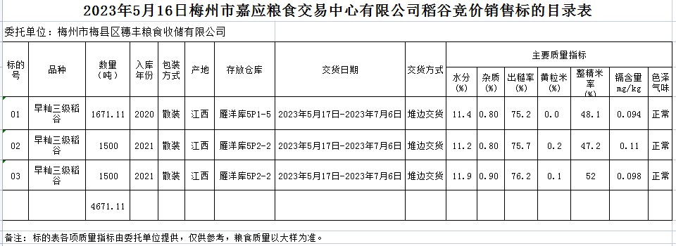 受客戶委托,梅州市嘉應(yīng)糧食交易中心有限公司定于2023年5月16日(星期二)舉辦糧食競(jìng)價(jià)交易會(huì)。梅州市梅縣區(qū)穗豐糧食收儲(chǔ)有限公司擬銷售2020、2021年早秈稻4671.11噸。