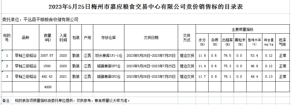 受客戶委托,梅州市嘉應糧食交易中心有限公司定于2023年5月25日(星期四)舉辦糧食競價交易會。平遠縣平糧糧食收儲有限公司擬銷售2020年、2021年早秈稻4000噸。