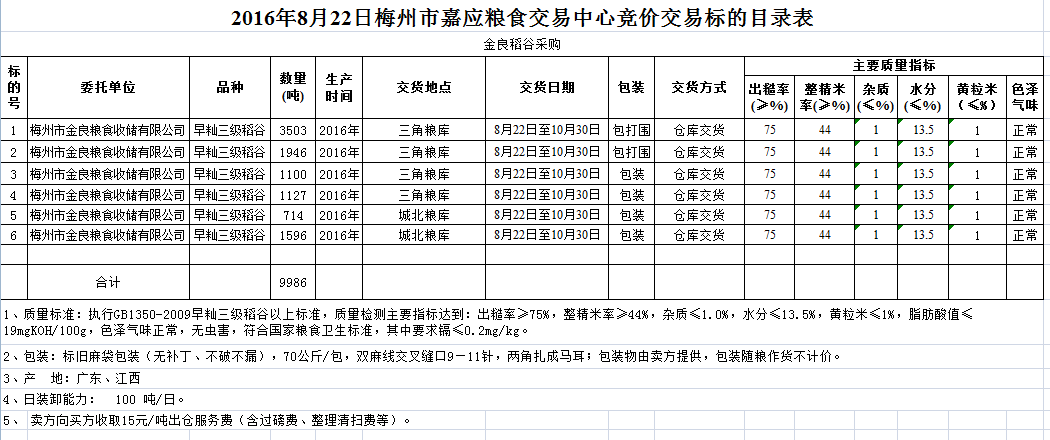 受客戶委托,梅州市嘉應糧食交易中心有限公司定于2016年8月22日舉辦糧食競價交易會,梅州市金良糧食收儲有限公司擬采購2016年產早秈三級稻谷9986噸。