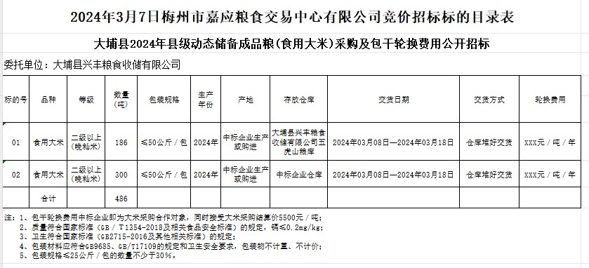 大埔縣2024年縣級動態(tài)儲備成品糧(食用大米)采購及包干輪換費(fèi)用公開招標(biāo)公告