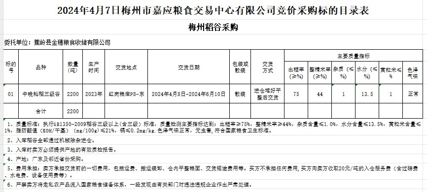受客戶(hù)委托,梅州市嘉應(yīng)糧食交易中心有限公司定于2024年4月7日(星期天)舉辦糧食競(jìng)價(jià)交易會(huì)。蕉嶺縣金穗糧食收儲(chǔ)有限公司擬采購(gòu)2023年產(chǎn)中晚秈稻2200噸。