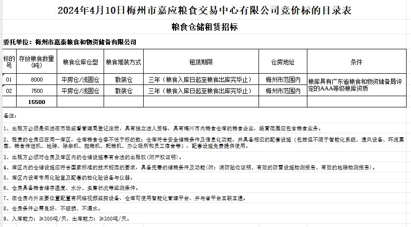 1.出租方必須是依法在市場監(jiān)督管理局登記注冊,具有獨(dú)立法人資格,具有梅州市內(nèi)糧食倉庫的糧食企業(yè),經(jīng)營范圍應(yīng)包含糧食業(yè)務(wù);