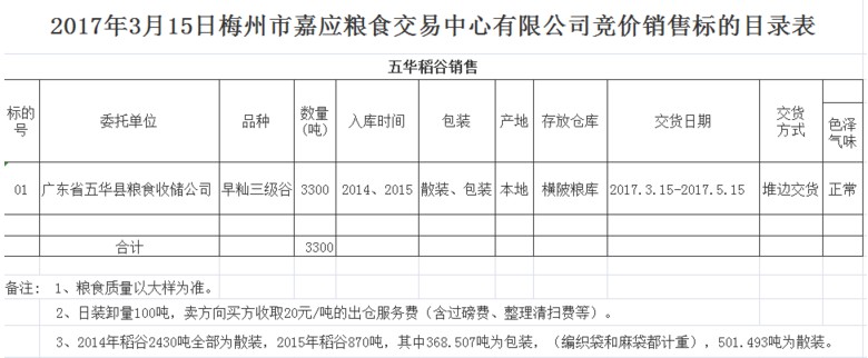 受客戶委托,梅州市嘉應(yīng)糧食交易中心有限公司定于2017年3月15日舉辦糧食競(jìng)價(jià)交易會(huì),廣東省五華縣糧食收儲(chǔ)公司擬銷售早秈三級(jí)稻谷3300噸。
