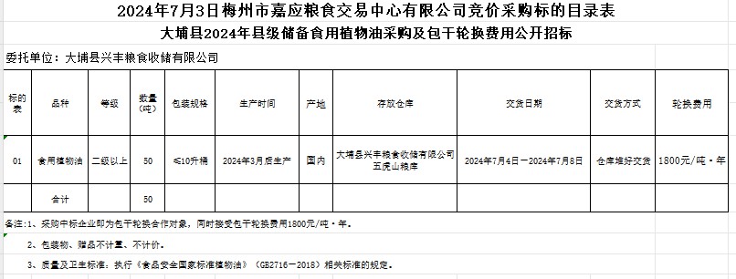 受大埔縣興豐糧食收儲(chǔ)有限公司委托,梅州市嘉應(yīng)糧食交易中心有限公司定于2024年7月3日(星期三)上午10時(shí)在廣東省梅州市彬芳大道南161號(hào)梅州市糧食交易中心3樓,舉辦大埔縣2024年縣級(jí)儲(chǔ)備食用植物油采購(gòu)及包干輪換費(fèi)用公開(kāi)招標(biāo)。