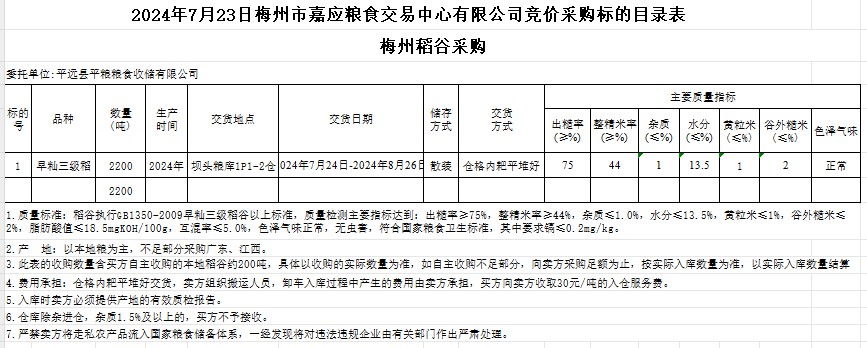 2024年7月23日平遠縣平糧糧食收儲有限公司稻谷采購