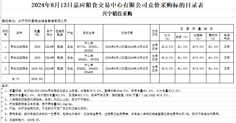 受客戶委托,梅州市嘉應(yīng)糧食交易中心有限公司定于2024年8月13日(星期二)舉辦糧食競價(jià)交易會(huì)。興寧市齊昌糧油儲備管理有限公司擬采購2024年產(chǎn)早秈稻8539.581噸。