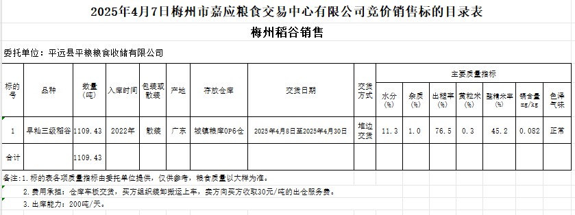 受客戶委托,梅州市嘉應(yīng)糧食交易中心有限公司定于2025年4月7日(星期一)舉辦糧食競價(jià)交易會(huì)。平遠(yuǎn)縣平糧糧食收儲(chǔ)有限公司擬銷售2022年產(chǎn)早秈稻1109.43噸。