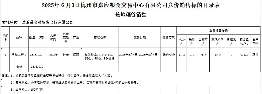 受客戶委托,梅州市嘉應(yīng)糧食交易中心有限公司定于2025年6月3日(星期二)舉辦糧食競(jìng)價(jià)交易會(huì)。蕉嶺縣金穗糧食收儲(chǔ)有限公司擬銷售2022年產(chǎn)早秈稻谷3616.930噸。