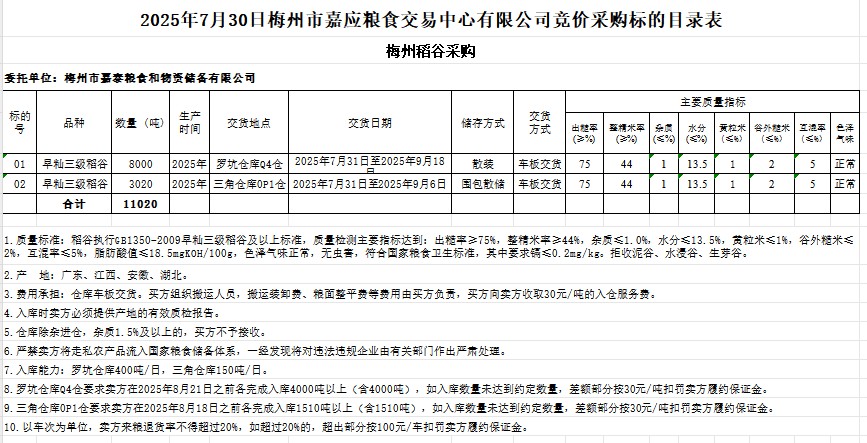 受客戶委托,梅州市嘉應(yīng)糧食交易中心有限公司定于2025年7月30日(星期三)舉辦糧食競價(jià)交易會(huì)。梅州市嘉泰糧食和物資儲(chǔ)備有限公司擬采購2025年產(chǎn)早秈稻谷11020噸。