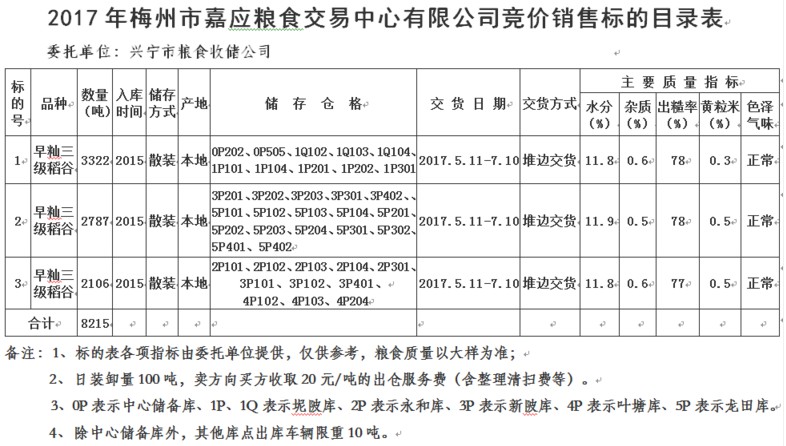 受客戶委托,梅州市嘉應(yīng)糧食交易中心有限公司定于2017年5月10日舉辦糧食競(jìng)價(jià)交易會(huì),興寧市糧食收儲(chǔ)公司擬銷(xiāo)售2015年早秈三級(jí)稻谷8215噸。(僅限現(xiàn)場(chǎng)交易)