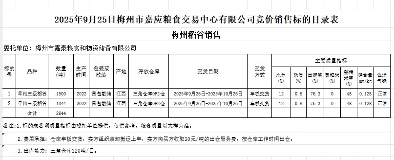 受客戶委托,梅州市嘉應糧食交易中心有限公司定于2025年9月25日(星期四)舉辦糧食競價交易會。梅州市嘉泰糧食和物資儲備有限公司擬銷售2022年產(chǎn)早秈稻谷2844噸。
