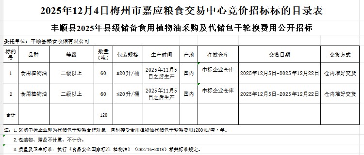 受豐順縣糧食收儲(chǔ)有限公司委托,梅州市嘉應(yīng)糧食交易中心有限公司定于2025年12月4日(星期四)上午10:00在廣東省梅州市彬芳大道南161號梅州市糧食交易中心3樓,舉辦豐順縣2025年縣級儲(chǔ)備食用植物油采購及代儲(chǔ)包干輪換費(fèi)用公開招標(biāo)。