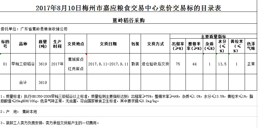 受客戶委托,梅州市嘉應糧食交易中心有限公司定于2017年8月10日舉辦糧食競價交易會,廣東省蕉嶺縣糧食收儲公司擬采購2017年早秈三級稻谷共3619噸。