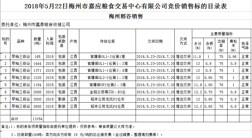 受客戶委托,梅州市嘉應(yīng)糧食交易中心有限公司定于2018年5月22日(星期二)舉辦糧食競價交易會,梅州市嘉泰糧食收儲公司擬銷售早秈稻13154噸。