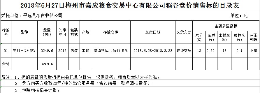 受客戶委托,梅州市嘉應(yīng)糧食交易中心有限公司定于2018年6月27日(星期三)舉辦糧食競價(jià)交易會(huì),平遠(yuǎn)縣糧食收儲(chǔ)公司擬銷售早秈稻3249.6噸。